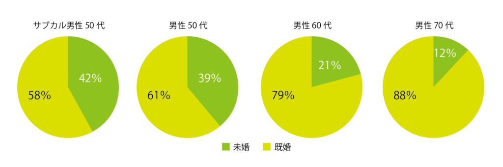サブカルおじさんを含め、50代の5人に2人は独身者です。60・70代男性と比べ、未婚率は圧倒的に高く、今までのシニアとは異なるシニアライフを送る可能性が見えてきました。家族ではなく、自分のために消費するシニアがこれから増えていくのではないでしょうか。