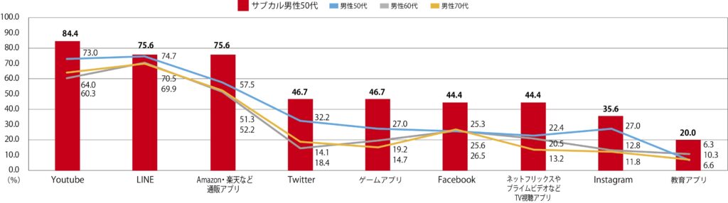 気持ちが若く、自分をシニアと思っていない。漫画、アニメ、ゲームに対しての興味関心が未だに高く、若年層のサブカルチャーに対する理解が高い。「歳をとったから卒業」ではなく、これからも日常的にサブカルに触れ続けたいと考えている。スマホやタブレットのアプリ使用率を見ても、多くの若者が使っているインスタやTwitterなども積極的に使っており、サブカルおじさんの気持ちの若々しさ、新しいものに取り組むことに躊躇せず楽しもうといったマインドがうかがえます。