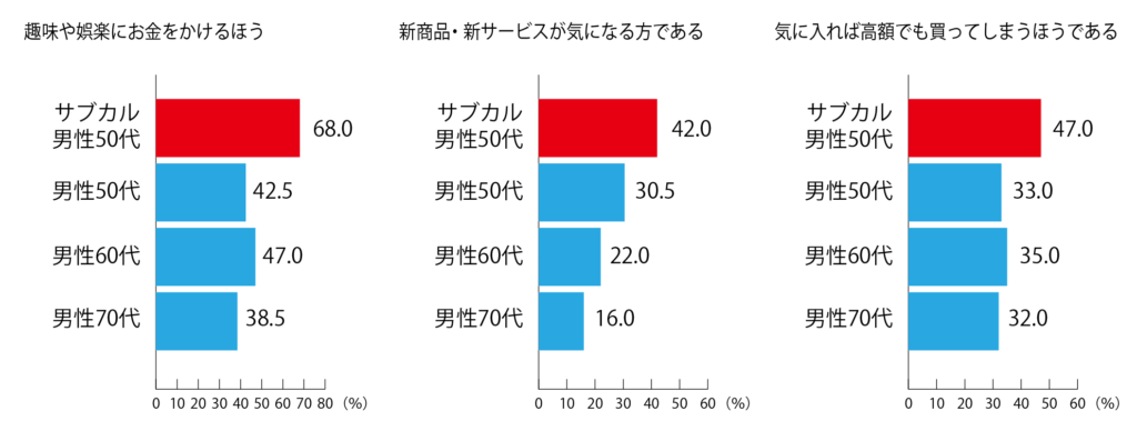 節約志向に向かうシニアが多い中で、同世代のなかでも物欲が旺盛。趣味・娯楽にお金をかけたい気持ちが強かったり、新しもの好きな人が多いのが特徴です。